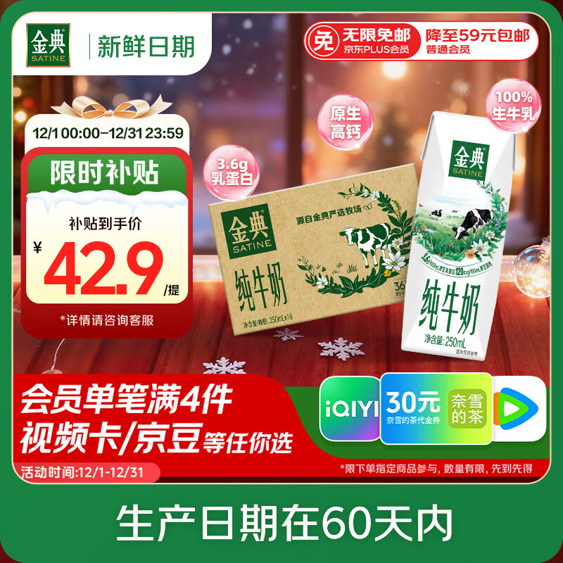 包邮 伊利【新鲜日期】金典纯牛奶整箱 250ml*16盒 3.6g乳蛋白 礼盒装